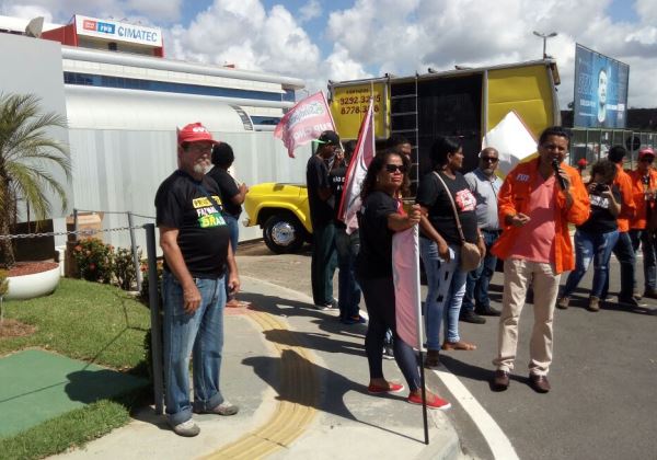 Sindicalistas ligados à Central Única dos Trabalhadores (CUT) realizam, na manhã desta sexta-feira (27), um protesto em frente ao Senai Cimatec, em Piatã, onde acontece evento com o ministro de Minas e Energia, Fernando Bezerra, e o secretário estadual de Desenvolvimento Econômico, Jaques Wagner.